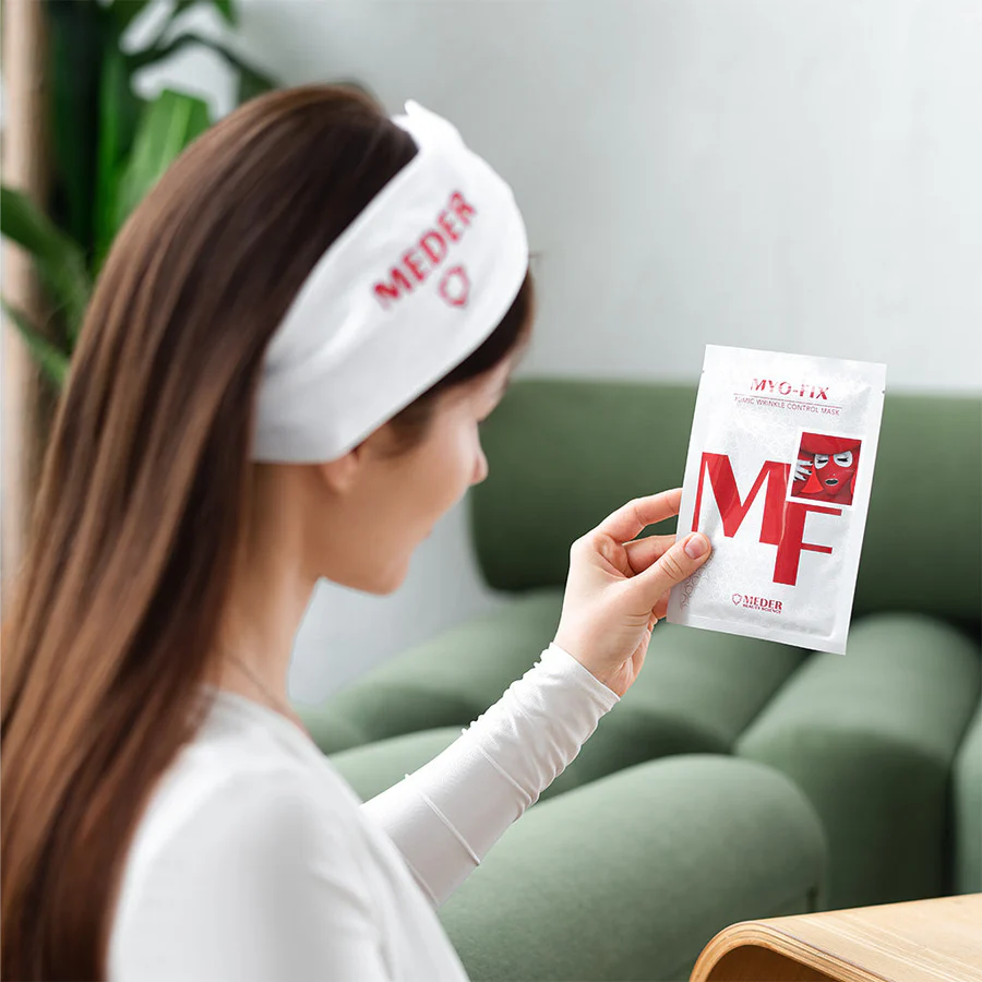Очистіть обличчя, нанесіть сироватку, як зазвичай. Нанесіть концентрат Міо-Фікс на лінії мімічних зморшок, помасуйте стираючими рухами, використовуючи ватяну паличку. Дістаньте маску з саше, розгорніть її і розправте на обличчі. Закріпіть бічні прорізи за вухами, потягніть нижню частину маски вниз, щоб закрити підборіддя, і зачепіть другу пару прорізів за вуха. Залиште на 20 хвилин. Після зняття маски втирайте активний гель, що залишився, до повного вбирання. Використовуйте 1-2 рази на тиждень або так часто, як ви побажаєте. Після цього нанесіть ваш крем Meder.